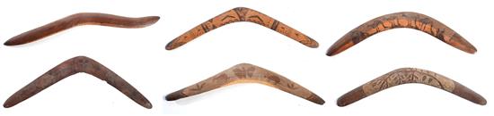 SIX BOOMERANGS INCL. A RARE WESTERN AUSTRALIAN ABORIGINAL BOOMERANG WITH STRAIGHT SECTION AND THE OTHER WITH CONCAVE CURVE; A SOUTH AUSTRALIAN BOOMERANG AND TWO OTHERS