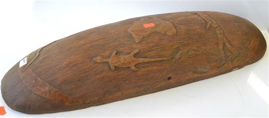 AN UNUSUAL ENGRAVED ABORIGINAL COOLAMON WITH ENCISED DECORATION, CIRCA 1940S