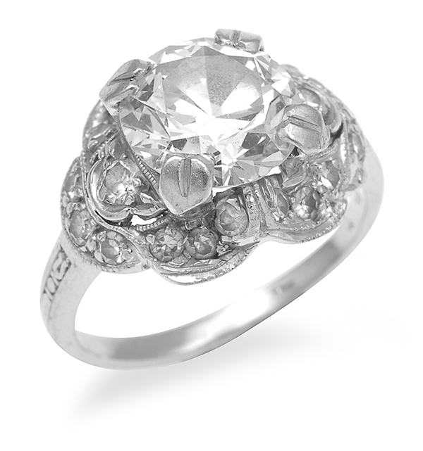 The early round brilliant cut diamond of 2.40cts set above a diamond set frame, mounted in platinum, ring size I.