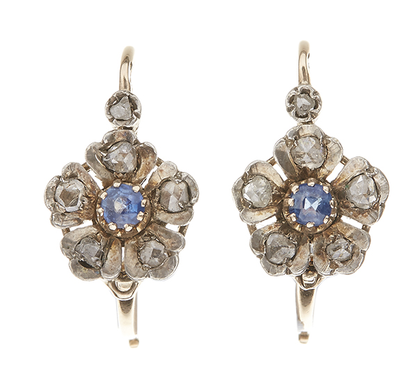 A PAIR OF ANTIQUE CONTINENTAL DIAMOND AND SAPPHIRE FLORAL EARRINGS