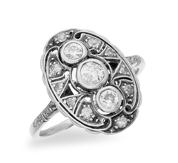 The oval pierced plaque set with three old European cut diamonds with further diamond detail throughout, mounted in silver and gold, ring size O.