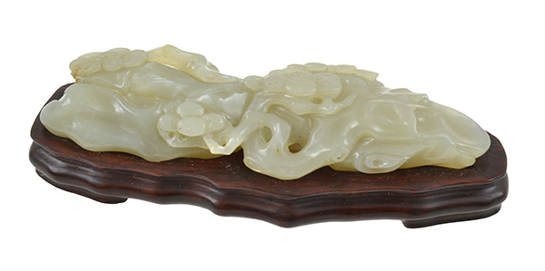 depicting pine trees growing from rock formations, even toned pale green jade, housed on fitted wooden stand, 14cm long including stand