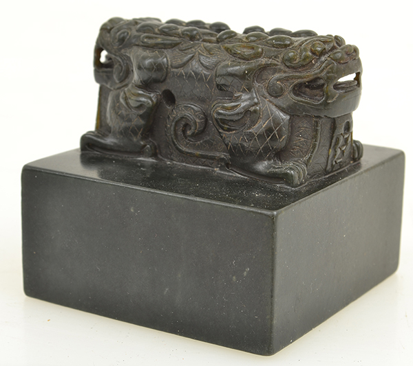 of square-form, surmounted with two qilin back to back, 7 x 7.5cm