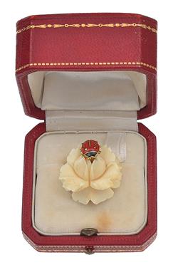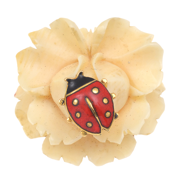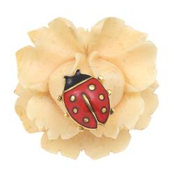The finely carved ivory flower surmounted by a red and black enamel ladybird, set in 18ct gold, signed, boxed.