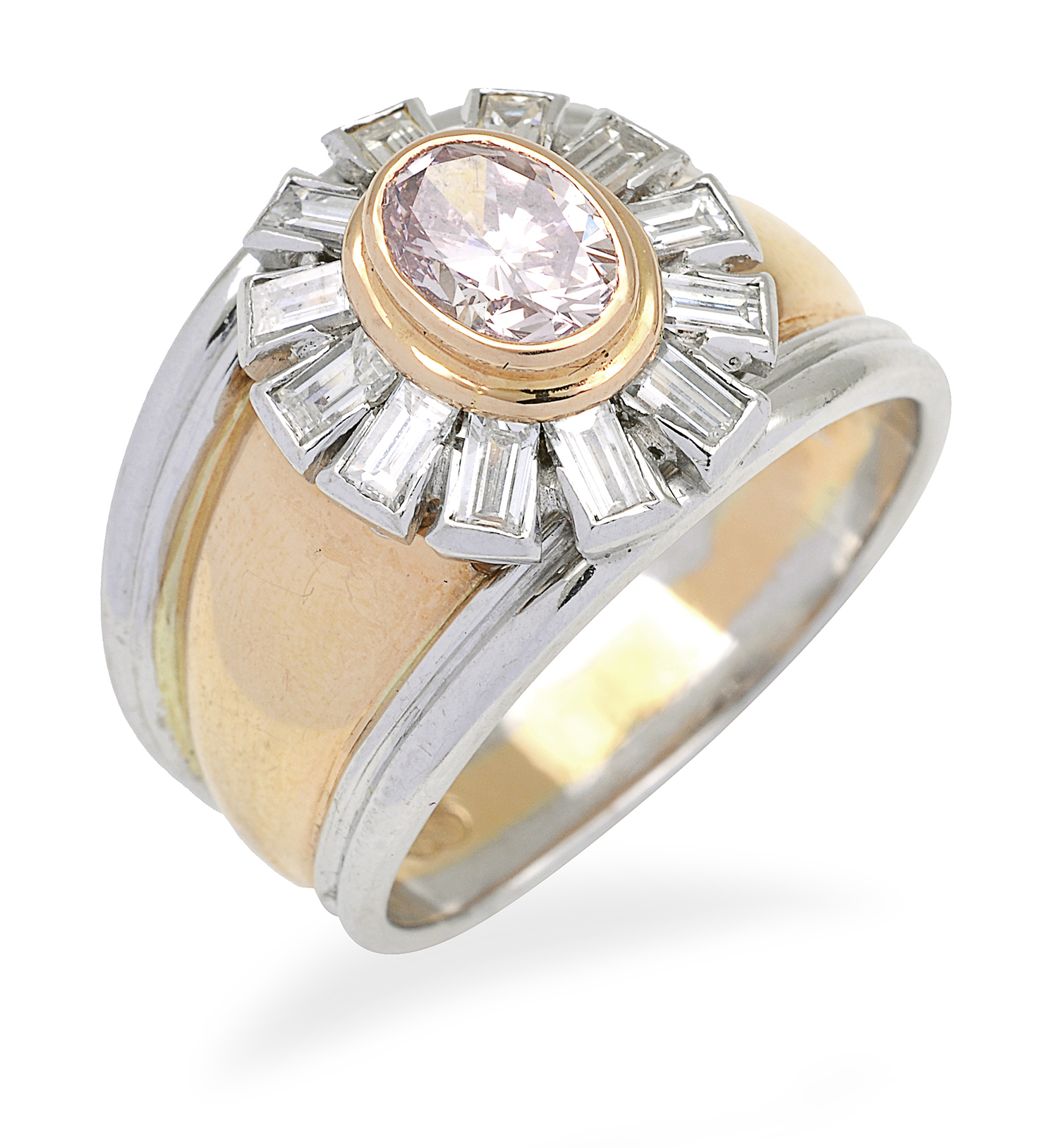 The oval cut pink diamond of 0.98cts surrounded by twelve baguette cut white diamonds, accompanied by Argyle Diamonds Certificate number 085629, stating colour 5P and clarity SI2, mounted in 18ct white and rose gold, ring size Q.