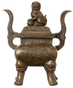 Featuring temple lion to lid and positioned on four paw feet, with double rising handles and Chinese symbols on the central body. 40cm high.