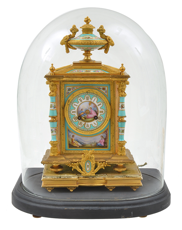 A SEVRES STYLE PORCELAIN & ORMOLU MANTLE CLOCK UNDER A GLASS DOME