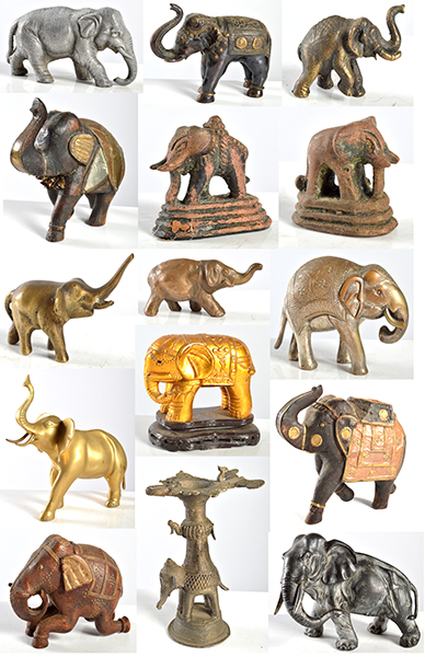 A LARGE COLLECTION OF METAL WORK AND COMPOSITE ELEPHANTS, INCL. SPELTER AND BRASS