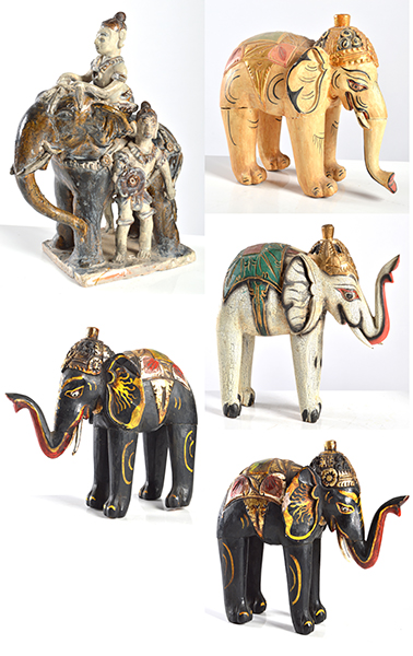 FOUR TIMBER ELEPHANTS, FASHIONED IN AN INDIAN STYLE AND A TERRACOTTA FIGURAL GROUP