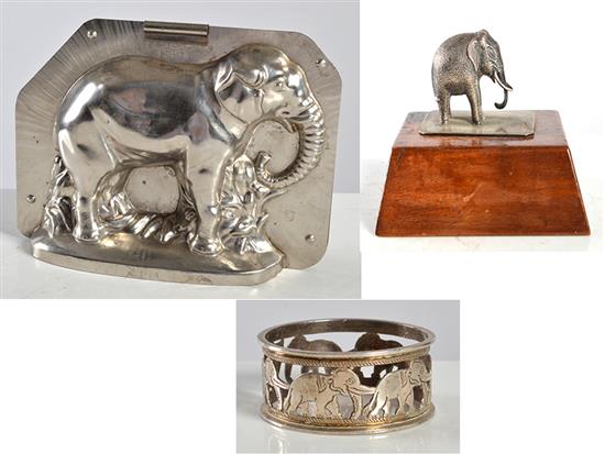 GROUP OF SILVERED ITEMS WITH AN ELEPHANT THEME, INCL. NAPKIN RING AND MOULD