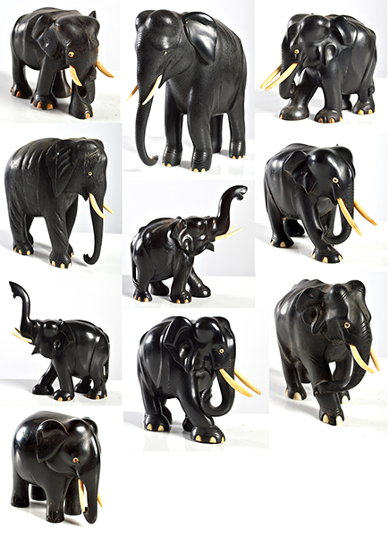 A GROUP OF TEN EBONY AND IVORY ELEPHANTS OF VARYING SIZES, 19TH CENTURY AND LATER