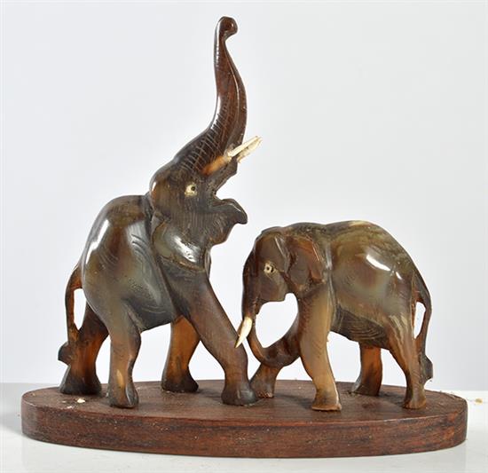 A BUFFALO HORN FIGURAL GROUP WITH AN ELEPHANT THEME MOUNTED ON A WOODEN BASE