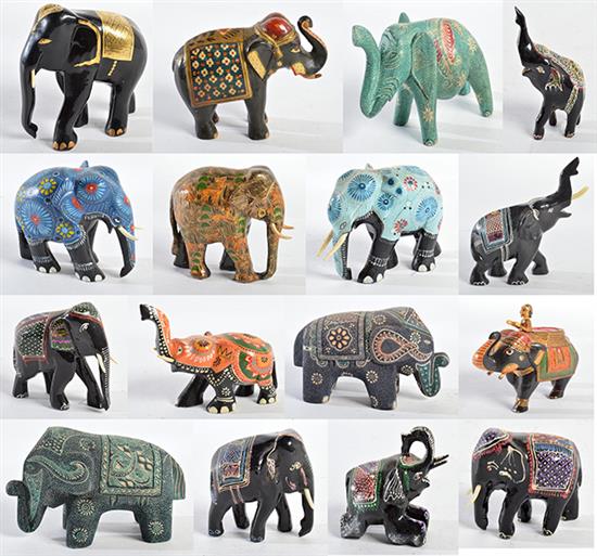 A BOX LOT LARGE GROUP OF PAINTED ELEPHANTS, INCL. LACQUER