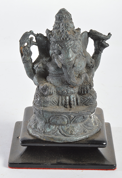 A BRONZE FIGURE OF GANESH MOUNTED ON A WOODEN BASE