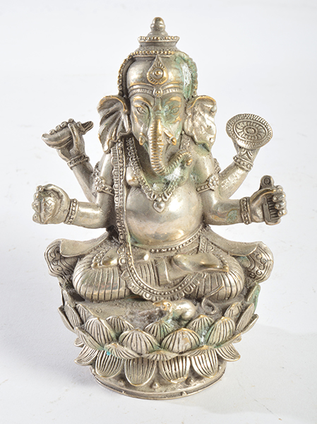 A SILVERED FIGURE OF GANESHA SEATED ON A LOTUS PEDESTAL