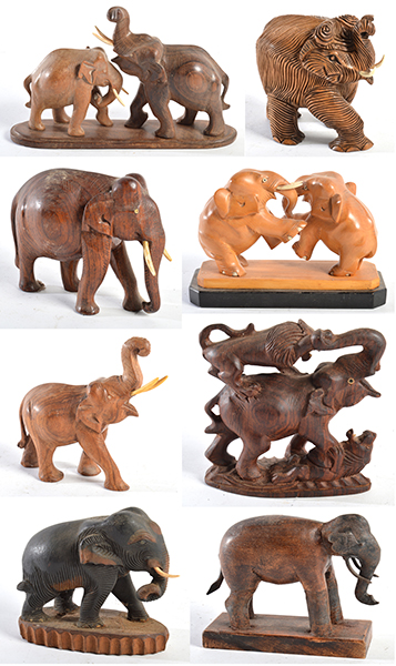 A COLLECTION OF EIGHT WOODEN ELEPHANTS, 19TH CENTURY AND LATER, SOME WITH IVORY DETAIL