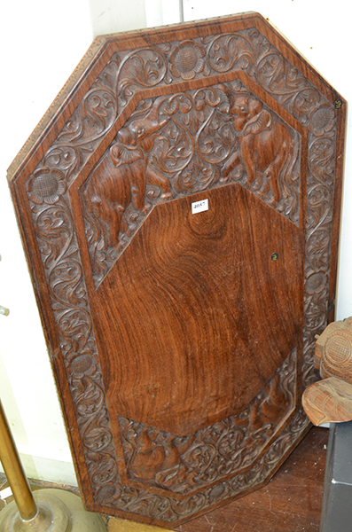 FIVE CARVED WOODEN WALL SCONCES WITH BONE DETAIL, WITH AN ELEPHANT THEME (ONE A/F), AS WELL AS A WOODEN TABLE TOP AND BRASS LAMP BASE
