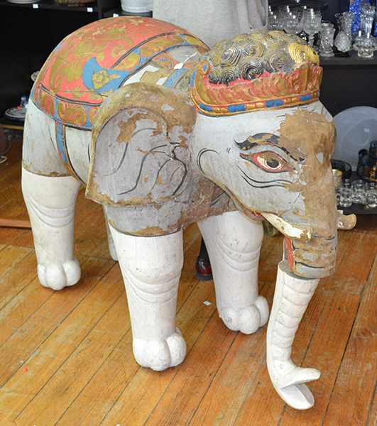 AN IMPRESSIVE 19TH CENTURY WOODEN POLYCHROME ELEPHANT, SLIGHTLY WORN