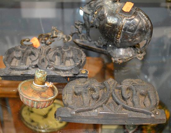 THREE SETS OF OPIUM SCALES AND A VINTAGE BRASS BELL (A/F)