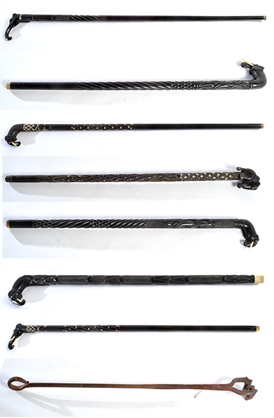 SEVEN EBONY AND IVORY WALKING STICKS WITH FIGURAL MOUNTS