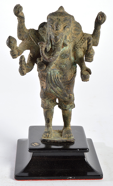 A 19TH CENTURY OR EARLIER BRONZE FIGURE OF GANESH ON LACQUER BASE