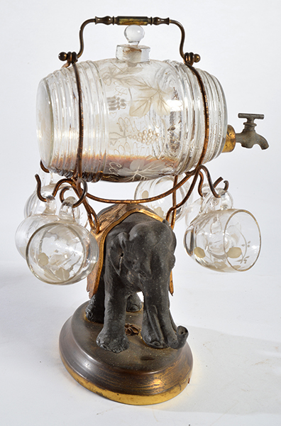 AN EARLY 20TH CENTURY DRINKS SET WITH ETCHED GLASSES, MOUNTED ON A BRONZE AND BRASS ELEPHANT, SLIGHT CHIPS