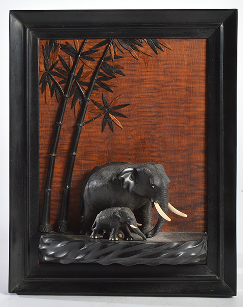 A MID-CENTURY TOURIST WARE WALL HANGING, APPLIED EBONY AND IVORY DETAIL