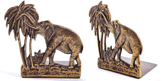 A PAIR OF BRASS BOOKENDS WITH AN ELEPHANT AND PALM TREE THEME
