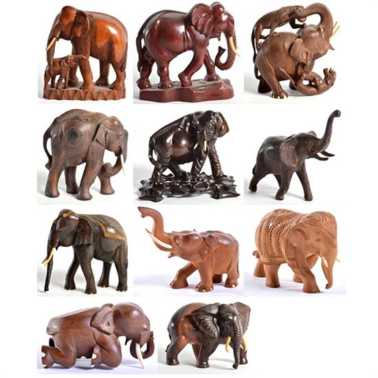 A LARGE GROUP OF ELEPHANT FIGURES MADE FROM VARYING WOODS