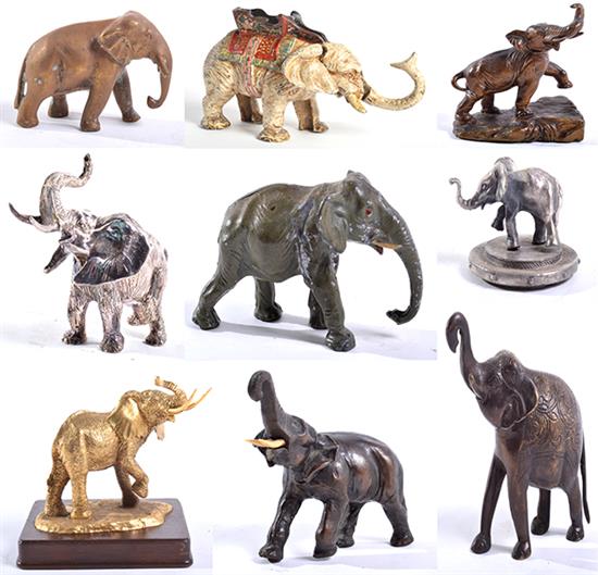 A CAST IRON ELEPHANT THEMED MONEY BOX AND OTHER ASSORTED ELEPHANT FIGURES, INCLUDING SILVER