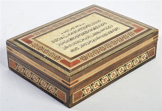 A 20TH CENTURY INDIAN BOX WITH MOTHER OF PEARL AND BONE INLAY, WITH SPOONS WITHIN