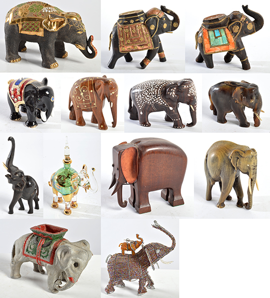 A QUANTITY OF ELEPHANTS IN VARIOUS STYLES & SIZES, INCL. BUFFALO HORN & A GLASS SCENT BOTTLE