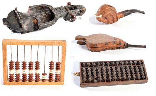 A GROUP OF ASSORTED ITEMS, INCL. ABACI, A BELLOW & A PIPE