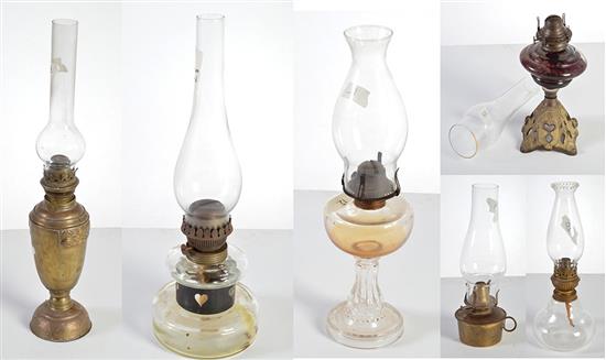 A SHELF OF SIX KEROSENE LAMPS, ALL WITHOUT SHADES