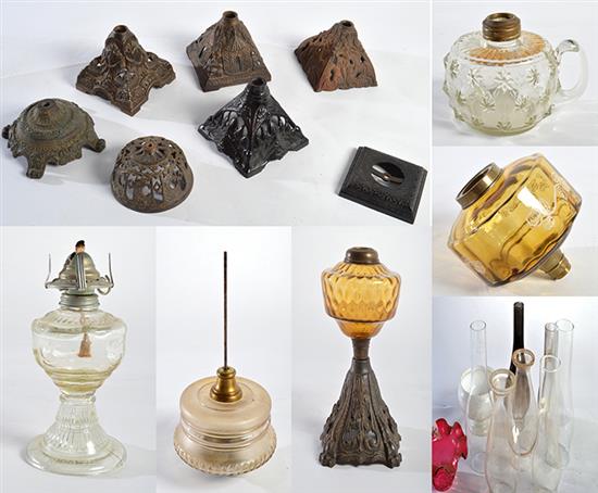 A BOX OF ASSORTED KEROSENE LAMP FIXTURES, INCL. BASES & CHIMNEYS