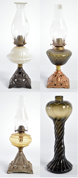 THREE KEROSENE LAMPS & A TURNED GLASS LAMP BASE