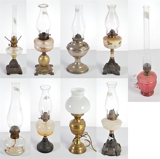 A SHELF OF NINE KEROSENE LAMPS, 19TH CENTURY & LATER, ONE ELECTRIFIED (SOME FAULTS)