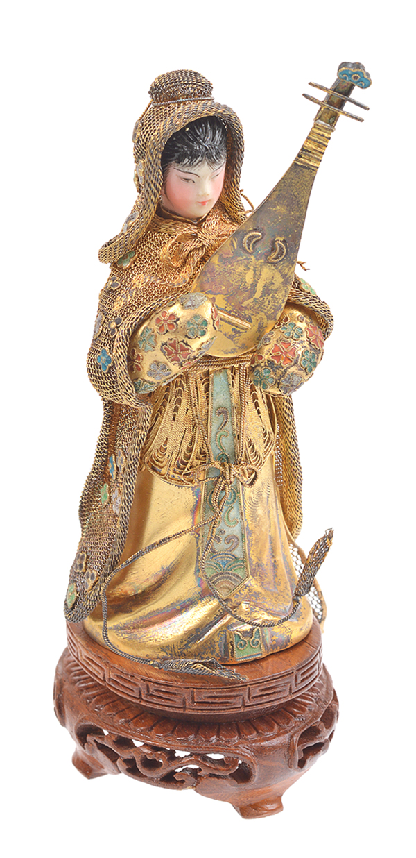 modelled as a young mandolin player costumed in an enamelled filigree cloak and shawl, with a stained ivory face, seated on wooden base, 14cm high including stand