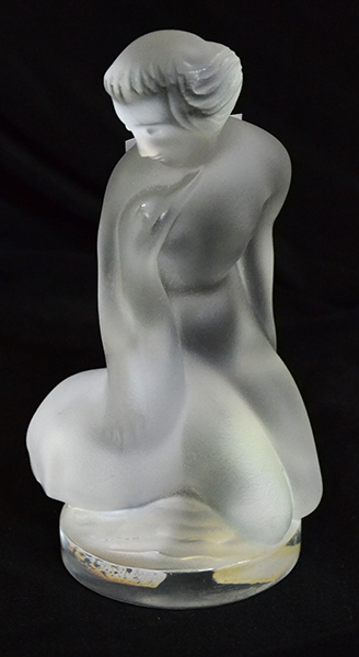 after the classical myth depicting a kneeling nude female with swan, etched "Lalique France" to base, carries its original Lalique paper label, 11.5 cm high
