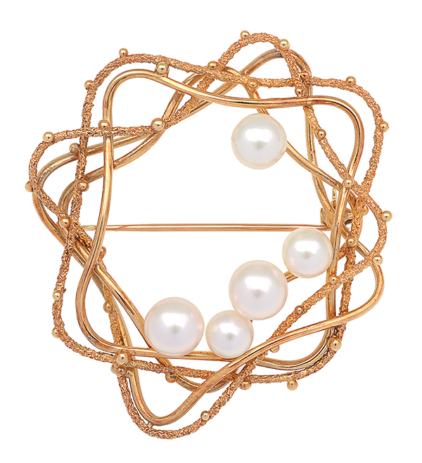 Of pierced design offset with five pearls, set in 14ct gold, signed.
