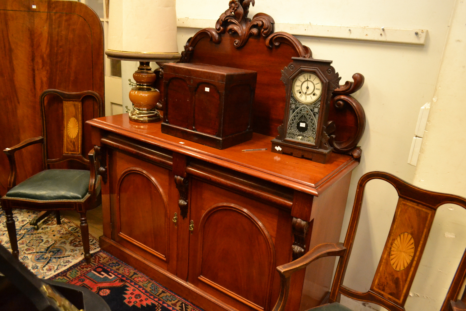 rectangular, with a solid back, above two ogee moulded frieze drawers and two arch panelled doors, plinth base, 152.5 x 95 x 55cm