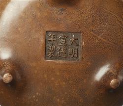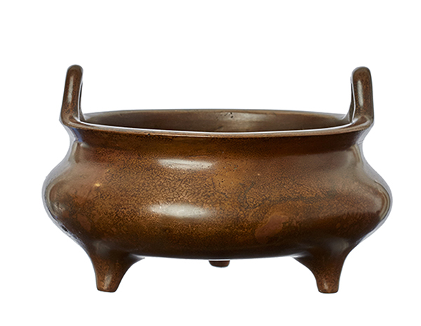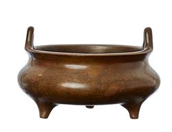 Tri-footed and featuring raised twin handles, mark to base. 10cm high.