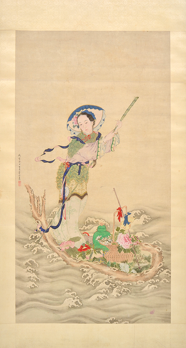 Ink and colour on paper, depicting the ever youthful and ethereal immortal 'Ma Gu' creating an orchard on the waters, dressed in flowing celestial robes, illustrated with feminine 'sloping shoulders', delicate hands and serene face, enjoying the languid movement of the river in a boat made from roots, and laden with lavish abundance, an inscription to the left section of the painting, the scroll measures 87.5cm wide, 2.24m long