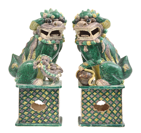 A PAIR OF CHINESE FAMILLE VERTE BISCUIT MODELS OF BUDDHIST LIONS (FO DOGS), 19TH CENTURY