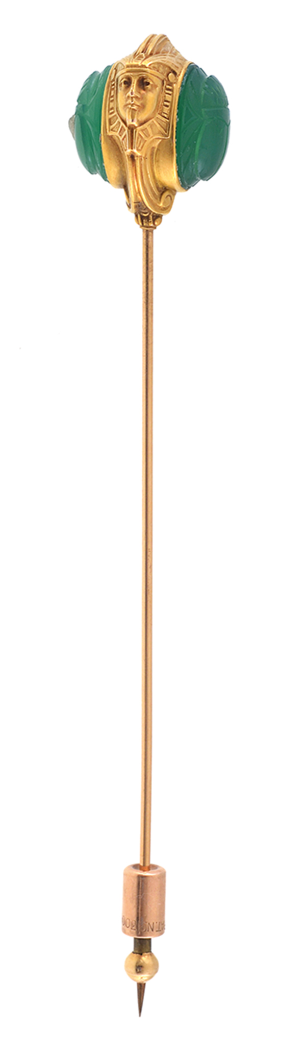 The double sided carved chrysoprase modelled as a scarab mounted in a frame depicting pharaonic and scroll motifs, all in gold.