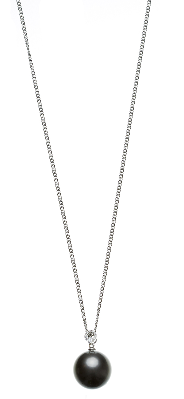 The round pearl of green grey hue measuring 14mm, suspended from a round brilliant cut diamond set surmount, mounted in 18ct white gold, total length 455mm.