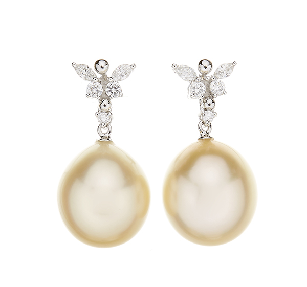 A PAIR OF GOLDEN SOUTH SEA PEAL AND DIAMOND EARRINGS