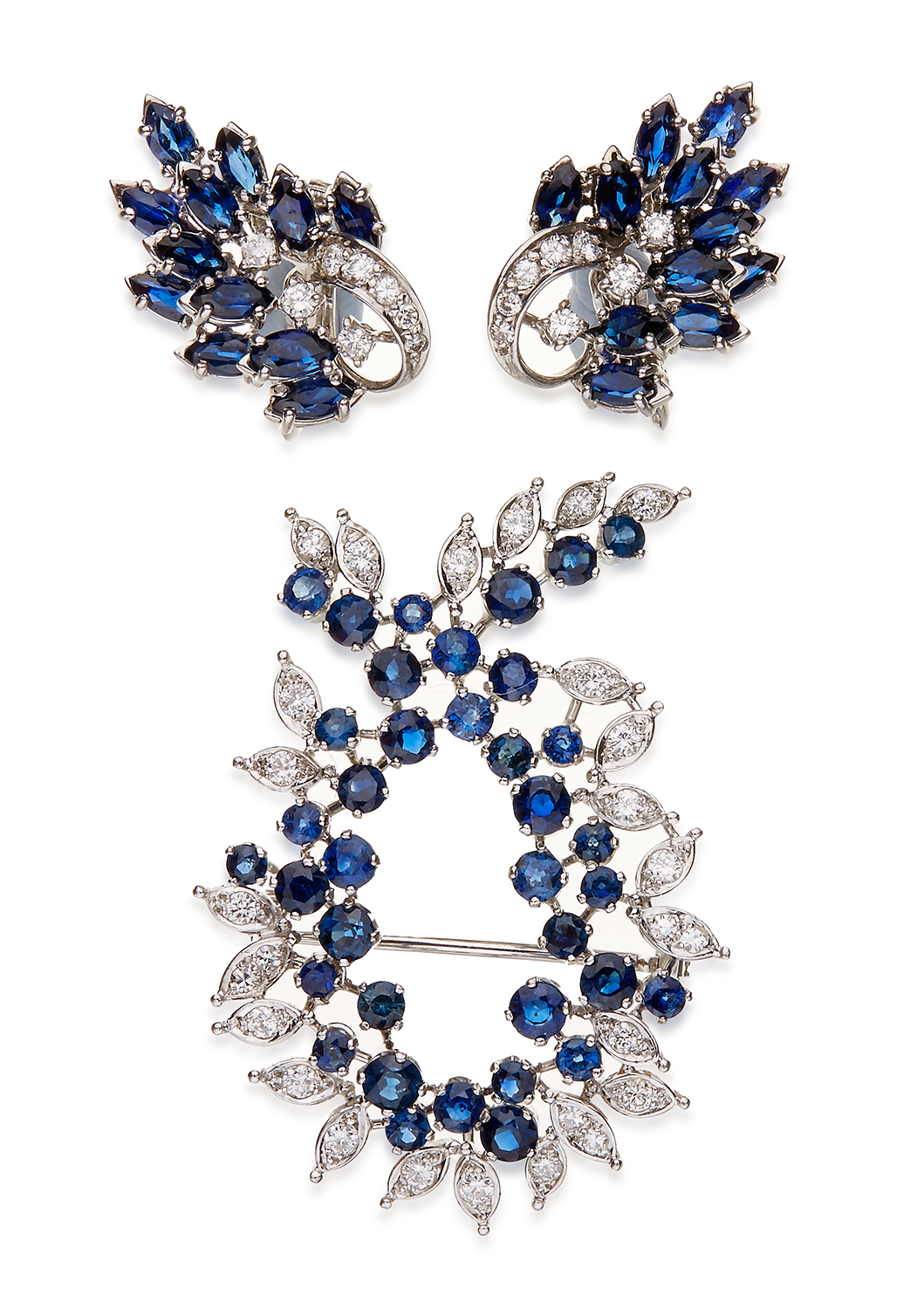Each piece presents in good condition,. Earrings having post and clip fititngs - posts are slightly bent, clips are firm. some sapphires are slightly abraided.
