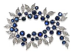 Of ribbon and spray design, the brooch featuring claw and grain set sapphires and round brilliant cut diamonds, together with earrings of conforming design, all mounted in 18ct white gold.