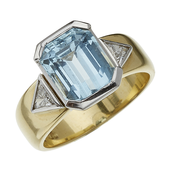 The emerald cut aquamarine of 3.24cts, flanked by trilliant cut diamonds totalling 0.24cts, mounted in 18ct white and yellow gold, ring size N.